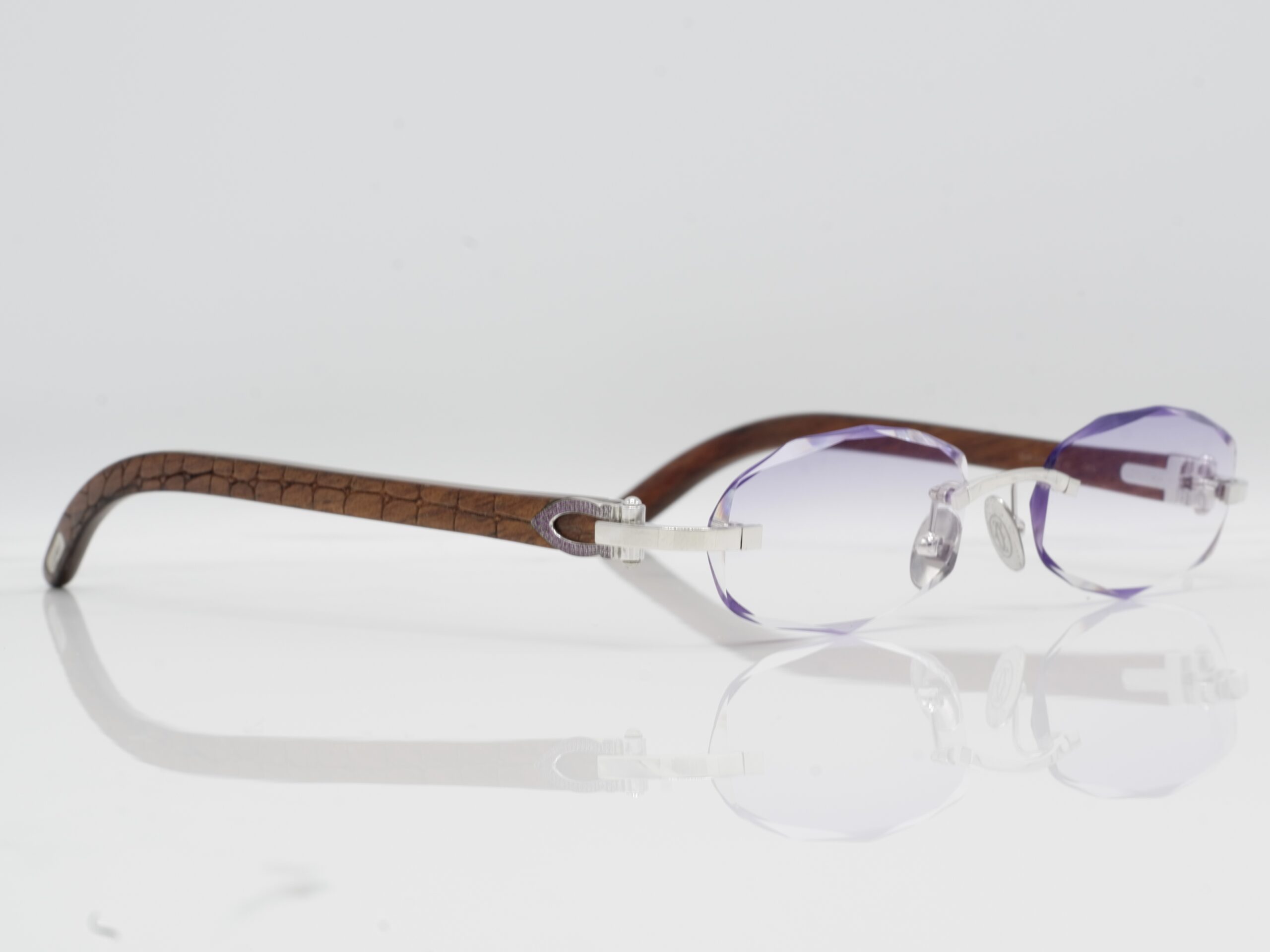 Amazing piece on its own, but even more beautiful with the gradient set pink sapphire stones on both C’s. The Cartier C-Decor with this Alligator engraving is one of the most sought after piece on the market. everyone who knows us knows we are not a great fan of customizing Cartier sunglasses with stones, but when you do it, do it right like these. This became a piece of art.