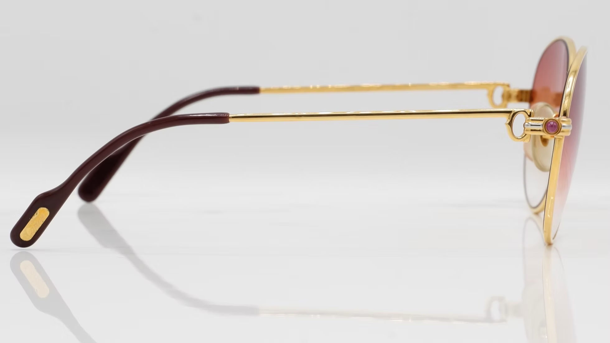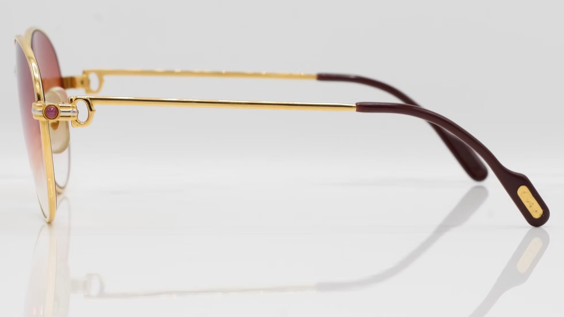 Beautiful Cartier piece with factory ruby stones at both sides. This pieces was stamped and made in 1988, but still in great condition. We’ve added brand new lenses with matching color to the ruby stones.